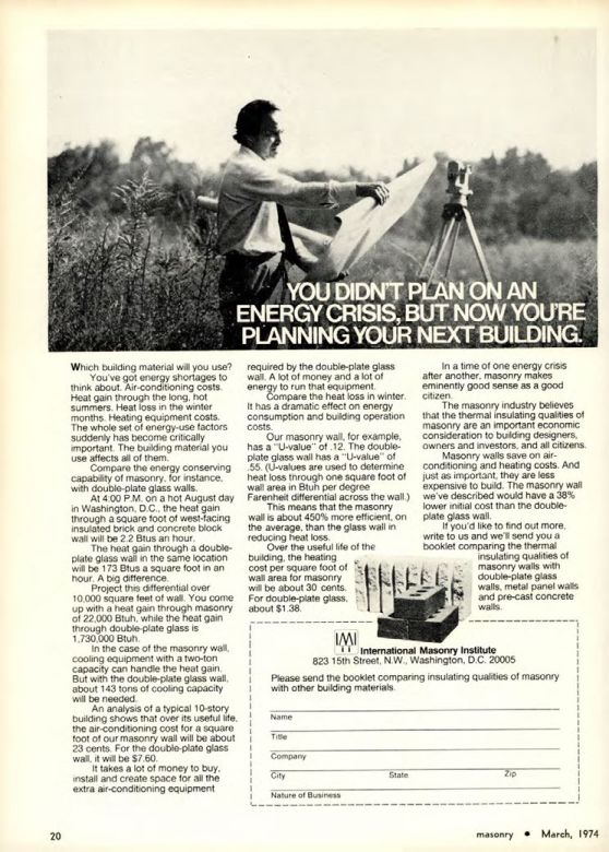 You've got energy shortages to think about. Air-conditioning costs. Heat gain through the long, hot summers. Heat loss in the winter months. Heating equipment costs. The whole set of energy-use factors suddenly has become critically important. The building material you use affects all of them.