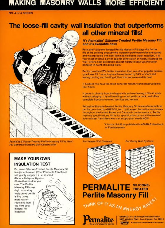 Permalite Silicone-Treated Perlite Masonry Fill is manufactured from perlite ore mined by GREFCO, Inc., by licensed Permalite franchisees throughout the United States and Canada in conformance to Perlite Institute specifications. Write for specification data and the name of your nearest franchisee who can supply your needs NOW.