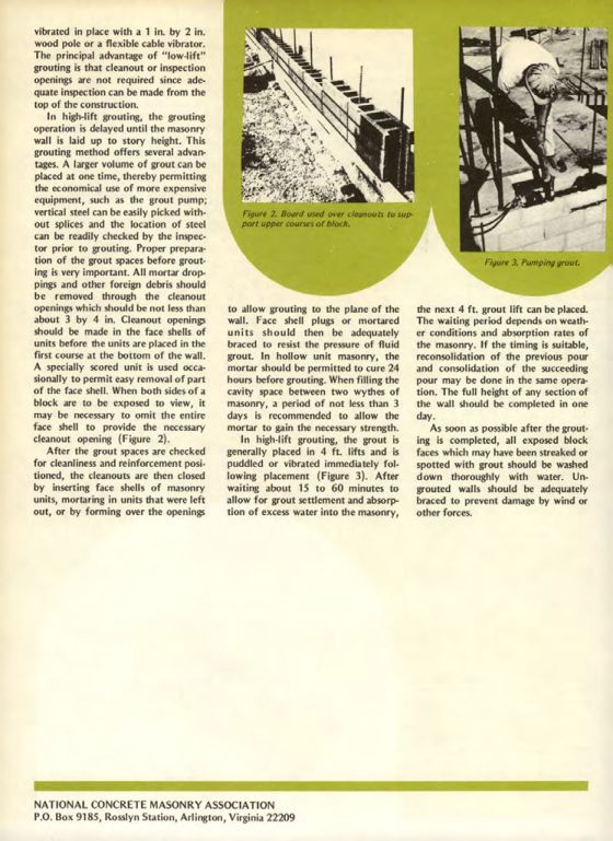 vibrated in place with a 1 in. by 2 in. wood pole or a flexible cable vibrator. The principal advantage of "low-lift" grouting is that cleanout or inspection openings are not required since adequate inspection can be made from the top of the construction.
