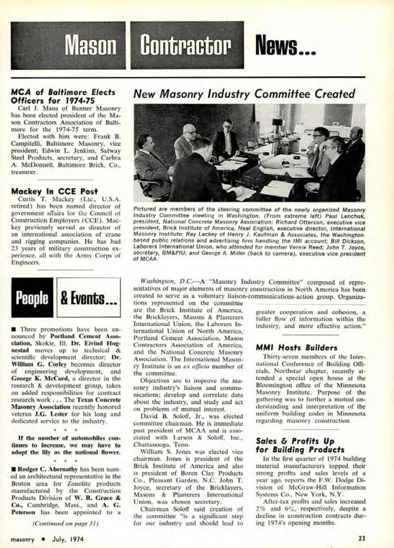 Washington, D.C.-A "Masonry Industry Committee" composed of representatives of major elements of masonry construction in North America has been created to serve as a voluntary liaison-communications-action group. Organizations represented on the committee are the Brick Institute of America, the Bricklayers, Masons & Plasterers International Union, the Laborers International Union of North America, Portland Cement Association, Mason Contractors Association of America, and the National Concrete Masonry Association. The International Masonry Institute is an ex officio member of the committee.