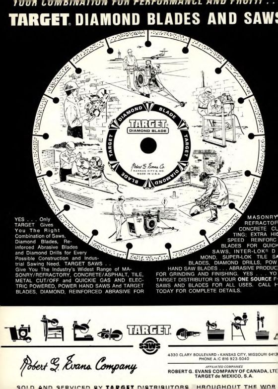 YES... Only TARGET Gives You The Right Combination of Saws, Diamond Blades, Reinforced Abrasive Blades and Diamond Drills for Every Possible Construction and Industrial Sawing Need. TARGET SAWS Give You The Industry's Widest Range of MASONRY/REFRACTORY, CONCRETE/ASPHALT, TILE, METAL CUT/OFF and QUICKIE GAS AND ELECTRIC POWERED, POWER HAND SAWS And TARGET BLADES, DIAMOND, REINFORCED ABRASIVE FOR MASONRY REFRACTOR CONCRETE CL TING: EXTRA HIC SPEED REINFORC BLADES FOR QUICK SAWS, INTER-LOK® DIAMOND, SUPER-LOK TILE SA BLADES, DIAMOND DRILLS, POW HAND SAW BLADES ABRASIVE PRODUC .. YO FOR GRINDING AND FINISHING. YES TARGET DISTRIBUTOR IS YOUR ONE SOURCE FOR SAWS AND BLADES FOR ALL USES. CALL FOR TODAY FOR COMPLETE DETAILS.