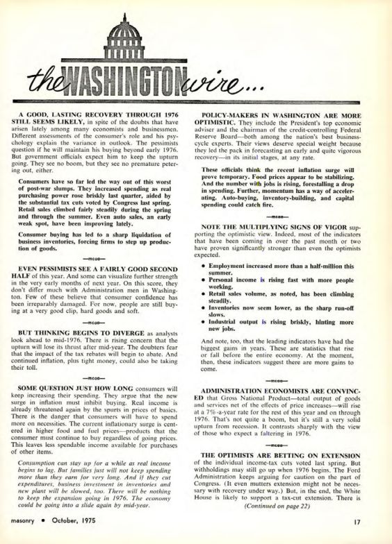 ADMINISTRATION ECONOMISTS ARE CONVINCED that Gross National Product-total output of goods and services net of the effects of price increases will rise at a 7%-a-year rate for the rest of this year and on through 1976. That's not quite a boom, but it's still a very solid upturn from recession. It contrasts sharply with the view of those who expect a faltering in 1976.