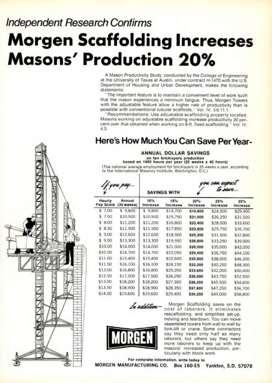 "The important feature is to maintain a convenient level of work such that the mason experiences a minimum fatigue. Thus, Morgen Towers with the adjustable feature allow a higher rate of productivity than is possible with conventional tubular scaffolds." Vol. IV, 3.6.11.1.