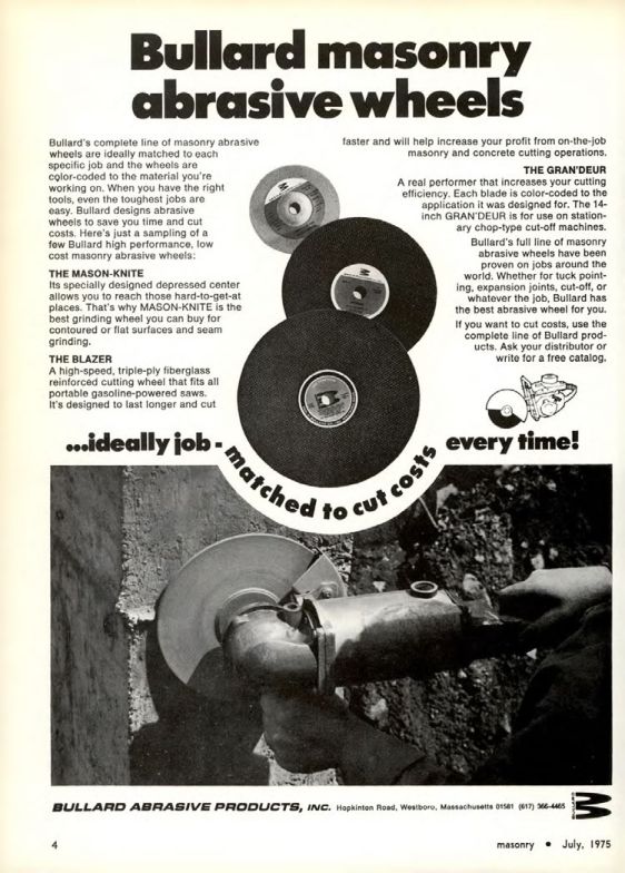 A real performer that increases your cutting efficiency. Each blade is color-coded to the application it was designed for. The 14-inch GRAN DEUR is for use on stationary chop-type cut-off machines. Bullard's full line of masonry abrasive wheels have been proven on jobs around the world. Whether for tuck pointing, expansion joints, cut-off, or whatever the job, Bullard has the best abrasive wheel for you. If you want to cut costs, use the complete line of Bullard products. Ask your distributor or write for a free catalog. ...ideally job-matched to cut costs every time!