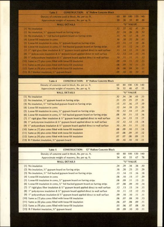 (5) Loose-fill insulation in cores, " gypsum board on furring strips