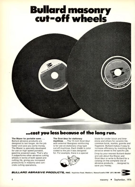 The Gran'deur for stationary machines... The 14-inch Gran'deur with external fiberglass reinforcing is for use on stationary chop type cut-off machines. Each blade is color coded to the job it was designed for. For example, there is a special blade for cinder block and limestone and others for ceramic tile, common brick, marble, granite and flagstone. Bullard makes it easy to increase efficiency by matching the abrasive wheel to the specific job. Drop by your nearest Bullard dealer and ask about the Blazer and Gran'deur or write to Bullard for a catalog on the complete line of abrasive products designed to save you money.