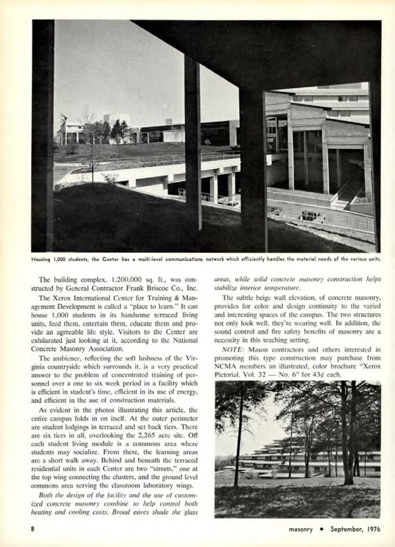 The building complex, 1,200,000 sq. ft., was constructed by General Contractor Frank Briscoe Co., Inc. The Xerox International Center for Training & Management Development is called a "place to learn." It can house 1,000 students in its handsome terraced living units, feed them, entertain them, educate them and provide an agreeable life style. Visitors to the Center are exhilarated just looking at it, according to the National Concrete Masonry Association.