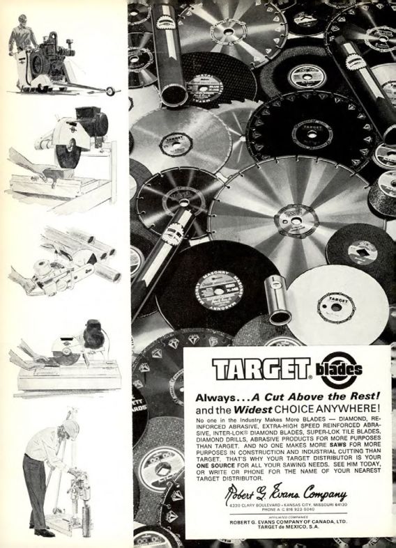 No one in the Industry Makes More BLADES DIAMOND, REINFORCED ABRASIVE, EXTRA-HIGH SPEED REINFORCED ABRASIVE, INTER-LOK DIAMOND BLADES, SUPER-LOK TILE BLADES, DIAMOND DRILLS, ABRASIVE PRODUCTS FOR MORE PURPOSES THAN TARGET, AND NO ONE MAKES MORE SAWS FOR MORE PURPOSES IN CONSTRUCTION AND INDUSTRIAL CUTTING THAN TARGET. THAT'S WHY YOUR TARGET DISTRIBUTOR IS YOUR ONE SOURCE FOR ALL YOUR SAWING NEEDS. SEE HIM TODAY, OR WRITE OR PHONE FOR THE NAME OF YOUR NEAREST TARGET DISTRIBUTOR.