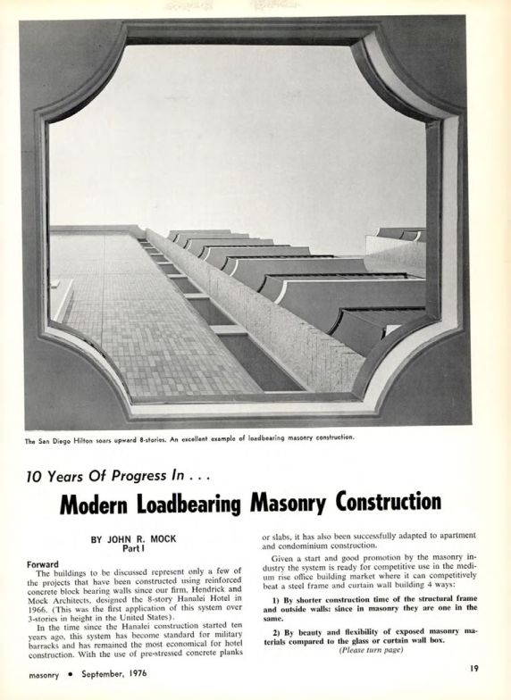 The buildings to be discussed represent only a few of the projects that have been constructed using reinforced concrete block bearing walls since our firm, Hendrick and Mock Architects, designed the 8-story Hanalei Hotel in 1966. (This was the first application of this system over 3-stories in height in the United States).
