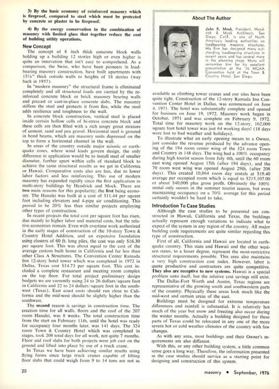John R. Mock, President, Hendrick & Mock Architects, San Diego, Calif, is one of North America's leading authorities on loadbearing masonry structures. His firm has designed many out. standing loadbearing structures in recent years and has several more in the planning stage. Many will remember him for his excellent presentation at the 76 MCAA Convention held at the Town & Country Hotel. San Diego.