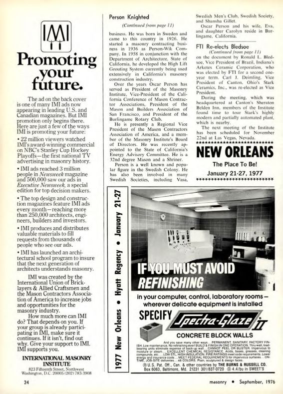 business. He was born in Sweden and came to this country in 1926. He started a masonry contracting business in 1936 as Person-Wik Company. In 1958 in conjunction with the Department of Architecture, State of California, he developed the High Lift Grouting System currently being used extensively in California's masonry construction industry.