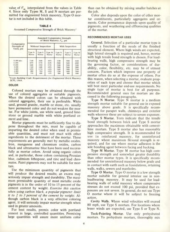 Value of fm interpolated from the values in Table 4. Since only Types M, S and N mortars are permitted for engineered brick masonry, Type O mortar is not included in this table.