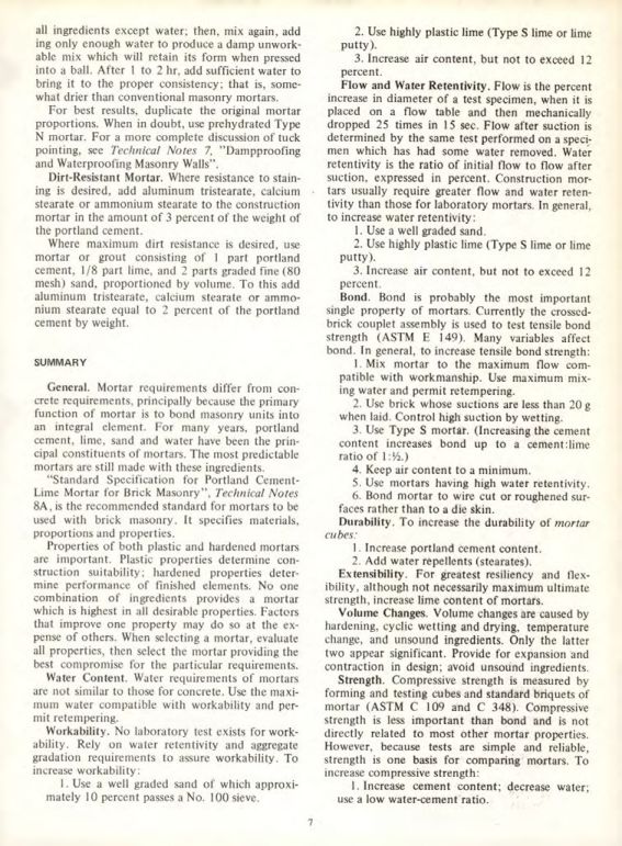 Water Content. Water requirements of mortars are not similar to those for concrete. Use the maximum water compatible with workability and permit retempering.