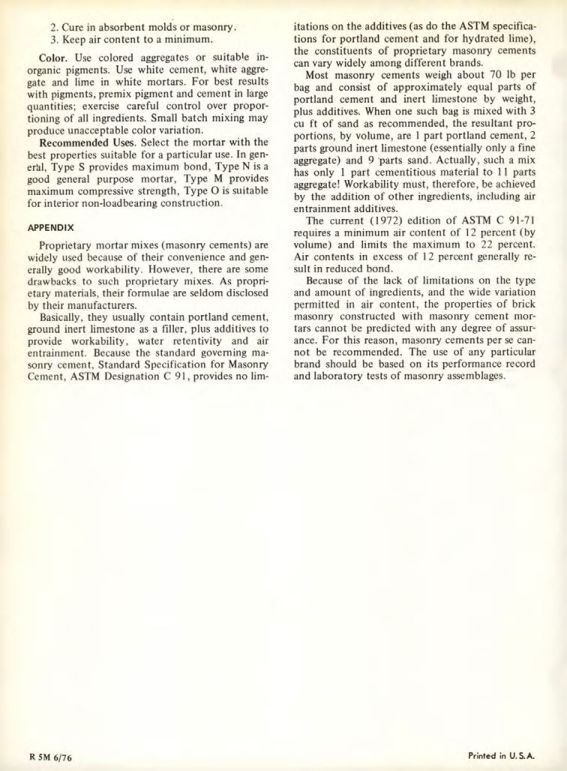 Most masonry cements weigh about 70 lb per bag and consist of approximately equal parts of portland cement and inert limestone by weight, plus additives. When one such bag is mixed with 3 cu ft of sand as recommended, the resultant proportions, by volume, are 1 part portland cement, 2 parts ground inert limestone (essentially only a fine aggregate) and 9 parts sand. Actually, such a mix has only 1 part cementitious material to 11 parts aggregate! Workability must, therefore, be achieved by the addition of other ingredients, including air entrainment additives.