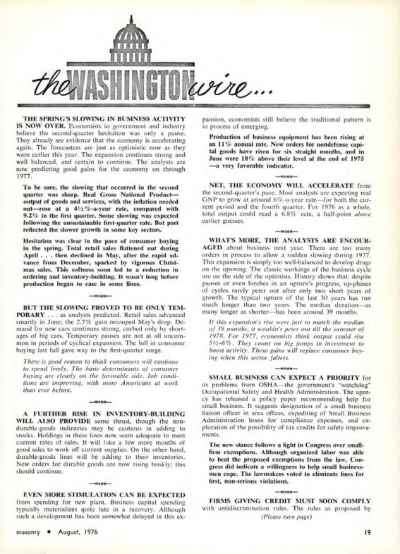 THE SPRING'S SLOWING IN BUSINESS ACTIVITY IS NOW OVER. Economists in government and industry believe the second-quarter hesitation was only a pause. They already see evidence that the economy is accelerating again. The forecasters are just as optimistic now as they were earlier this year. The expansion continues strong and well balanced, and certain to continue. The analysts are now predicting good gains for the economy on through 1977.