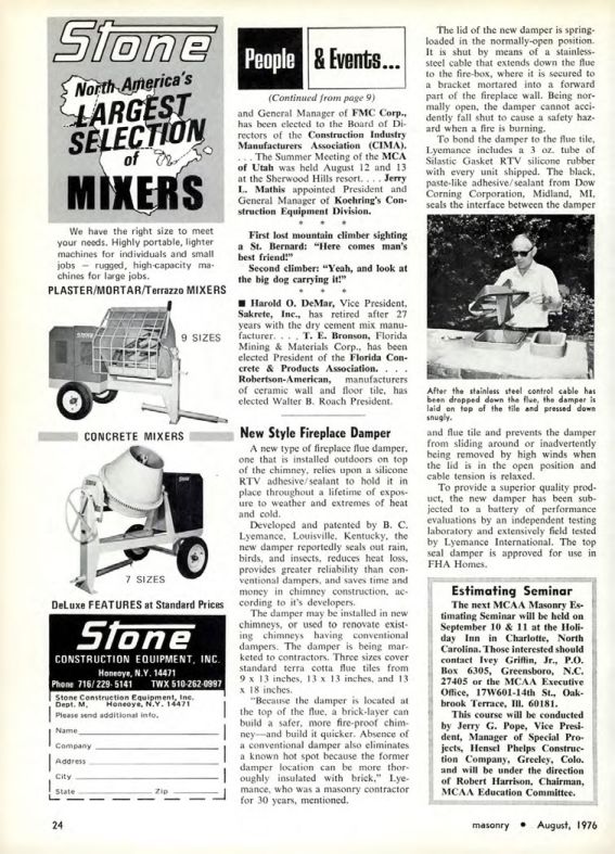 "Because the damper is located at the top of the flue, a brick-layer can build a safer, more fire-proof chimney-and build it quicker. Absence of a conventional damper also eliminates a known hot spot because the former damper location can be more thoroughly insulated with brick," Lyemance, who was a masonry contractor for 30 years, mentioned.