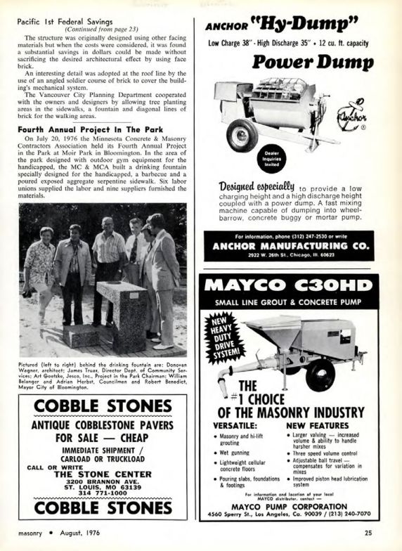 On July 20, 1976 the Minnesota Concrete & Masonry Contractors Association held its Fourth Annual Project in the Park at Moir Park in Bloomington. In the area of the park designed with outdoor gym equipment for the handicapped, the MC & MCA built a drinking fountain specially designed for the handicapped, a barbecue and a poured exposed aggregate serpentine sidewalk. Six labor unions supplied the labor and nine suppliers furnished the materials.