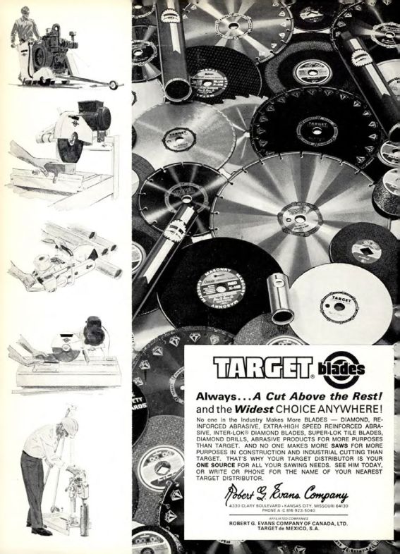 No one in the Industry Makes More BLADES DIAMOND, REINFORCED ABRASIVE, EXTRA-HIGH SPEED REINFORCED ABRASIVE, INTER-LOK® DIAMOND BLADES, SUPER-LOK TILE BLADES, DIAMOND DRILLS, ABRASIVE PRODUCTS FOR MORE PURPOSES THAN TARGET. AND NO ONE MAKES MORE SAWS FOR MORE PURPOSES IN CONSTRUCTION AND INDUSTRIAL CUTTING THAN TARGET. THAT'S WHY YOUR TARGET DISTRIBUTOR IS YOUR ONE SOURCE FOR ALL YOUR SAWING NEEDS. SEE HIM TODAY, OR WRITE OR PHONE FOR THE NAME OF YOUR NEAREST TARGET DISTRIBUTOR.