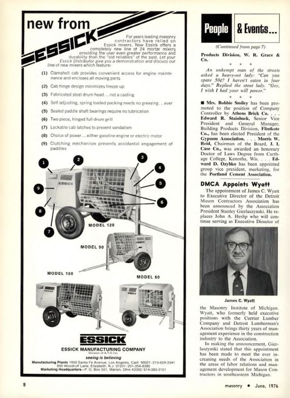 The appointment of James C. Wyatt to Executive Director of the Detroit Mason Contractors Association has been announced by the Association President Stanley Gierlaszynski. He replaces John A. Heslip who will continue serving as Executive Director of the Masonry Institute of Michigan. Wyatt, who formerly held executive positions with the Currier Lumber Company and Detroit Lumberman's Association brings thirty years of management experience in the construction industry to the Association.