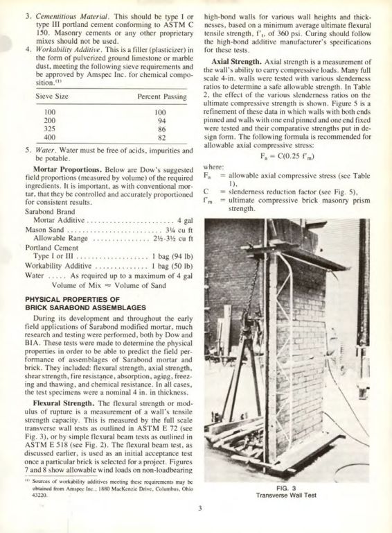 During its development and throughout the early field applications of Sarabond modified mortar, much research and testing were performed, both by Dow and BIA. These tests were made to determine the physical properties in order to be able to predict the field performance of assemblages of Sarabond mortar and brick. They included: flexural strength, axial strength, shear strength, fire resistance, absorption, aging, freezing and thawing, and chemical resistance. In all cases, the test specimens were a nominal 4 in. in thickness.