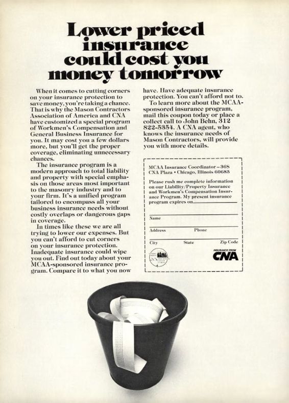 When it comes to cutting corners on your insurance protection to save money, you're taking a chance. That is why the Mason Contractors Association of America and CNA have customized a special program of Workmen's Compensation and General Business Insurance for you. It may cost you a few dollars more, but you'll get the proper coverage, eliminating unnecessary chances.