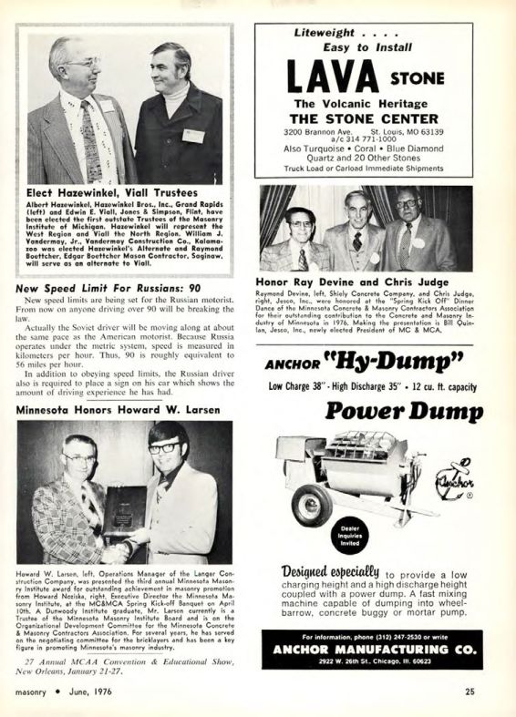 Howard W. Larsen, left, Operations Manager of the Langer Construction Company, was presented the third annual Minnesota Masonry Institute award for outstanding achievement in masonry promotion from Howard Noziska, right, Executive Director the Minnesota Masonry Institute, at the MC&MCA Spring Kick-off Banquet on April 10th. A Dunwoody Institute graduate, Mr. Larsen currently is a Trustee of the Minnesota Masonry Institute Board and is on the Organizational Development Committee for the Minnesota Concrete & Masonry Contractors Association. For several years, he has served on the negotiating committee for the bricklayers and has been a key figure in promoting Minnesota's masonry industry.