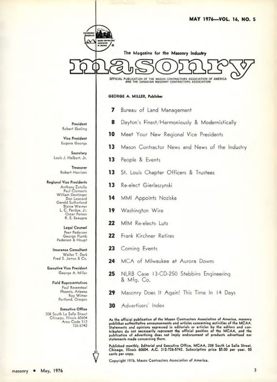 As the official publication of the Mason Contractors Association of America, masonry publishes authoritative announcements and articles concerning activities of the MCAA. Statements and opinions expressed in editorials or articles by the editors and contributors do not necessarily represent the official position of the MCAA, and the publication of advertising does not imply endorsement of products advertised nor statements made concerning them.