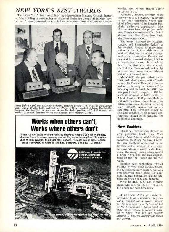 Anthony J Zotollo, president of the masonry group, presented the awards to the four companies whose combined efforts resulted in Lincoln Hospital's distinctive appearance: Max Urbahn Associates, the project architect; Turner Construction Co.; D & F Masons; and New York State Facilities Development Corp. The awards honored the "excellent concept and imaginative design" of the hospital. Among its many innovations is an 18 foot high "wall of motion", designed by noted architectural artist Alexandra Kasuba and executed in a curved design of bricks set to simulate waves. It is believed this is the first time the dramatic effect of three dimensional brick sculpture has been created as an inherent part of a structural wall. Mr. Zotollo also paid tribute to the "fast track phasing construction" method used by Turner. This system is credited with trimming 14 months off the time required to build the $100 million plus Lincoln Hospital, a 900 bed teaching hospital affiliated with the Albert Einstein College of Medicine and with extensive research and outpatient-emergency facilities, covering over 1,700,000 square feet on a 9 acre site. This technique allows design and construction to proceed concurrently instead of in sequence, the traditional approach.