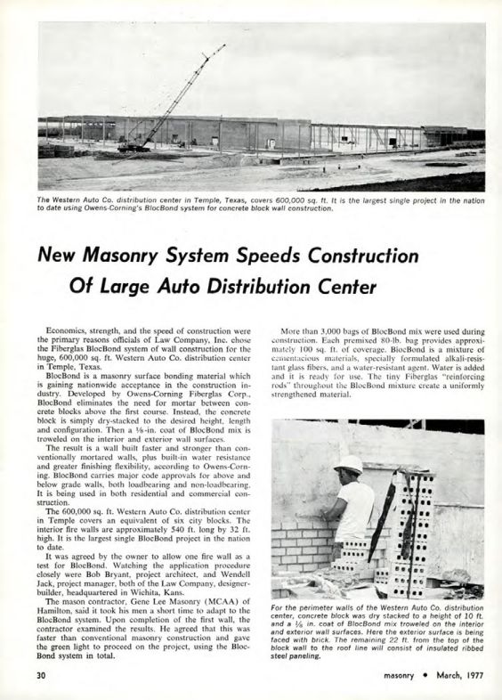 The Western Auto Co. distribution center in Temple, Texas, covers 600,000 sq. ft. It is the largest single project in the nation to date using Owens-Corning's BlocBond system for concrete block wall construction.