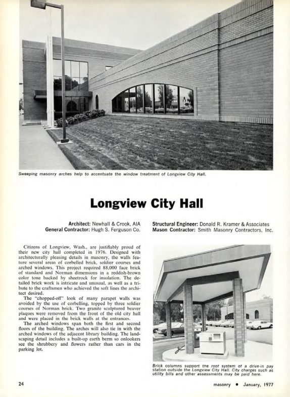 Citizens of Longview, Wash., are justifiably proud of their new city hall completed in 1976. Designed with architecturally pleasing details in masonry, the walls feature several areas of corbelled brick, soldier courses and arched windows. This project required 88,000 face brick of standard and Norman dimensions in a reddish-brown color tone backed by sheetrock for insulation. The detailed brick work is intricate and unusual, as well as a tribute to the craftsmen who achieved the soft lines the architect desired.