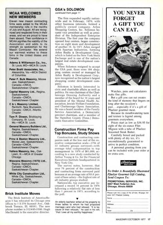 Eleven new mason contracting firms were added to the MCAA membership rolls in the months of July and August. All are recognized and respected firms in their areas, and we are proud to have them aboard. Their confidence in MCAA signifies the viability of the Association and adds to its strength as spokesman for the Mason Contractor. We extend our warmest wishes to these firms in the United States and Canada: