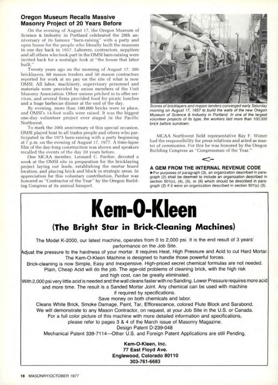 One MCAA member, Leonard C. Pardue, devoted a week at the OMSI site in preparation for the bricklaying project laying out leads, establishing the mortar board location, and placing brick and block in strategic areas. In appreciation for this voluntary contribution, Pardue was honored as "Contractor of the Year" by the Oregon Building Congress at its annual banquet.