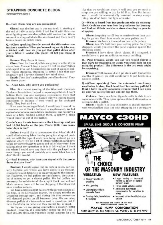 Bronson: I would agree that in certain cases, particularly highrise jobs where you have doors to go through, strapping would definitely be an advantage to the contractor. However, we feel pallets are satisfactory. We spent a lot of money to get a decent pallet. We feel pallets are necessary for architectural block, split block, and colored block because there will be less chipping if the block rest on a wooden surface.
