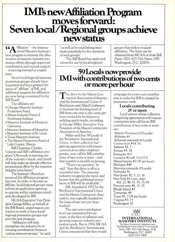 The International Masonry Institute's new "Affiliation" program is moving forward at a rapid pace. The program aims to increase the effectiveness of masonry industry promotion efforts through improved coordination and mutual support.