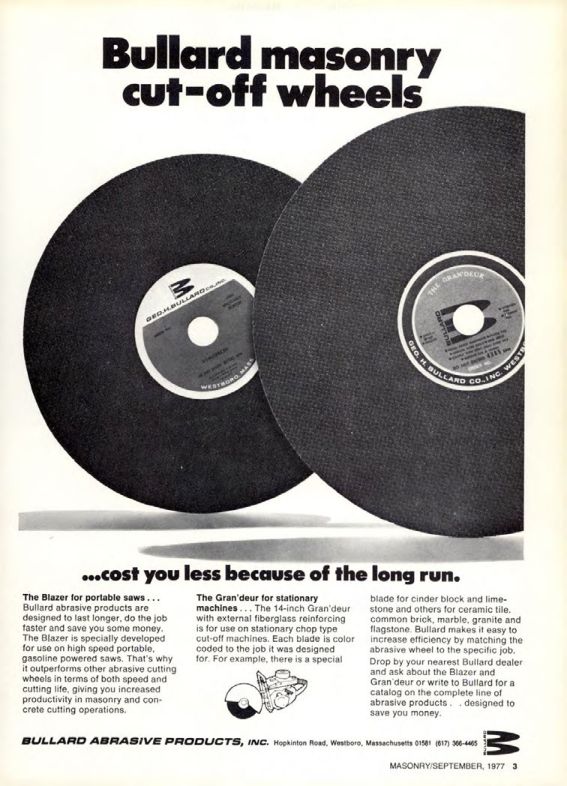 The Gran'deur for stationary machines. The 14-inch Gran'deur with external fiberglass reinforcing is for use on stationary chop type cut-off machines. Each blade is color coded to the job it was designed for. For example, there is a special blade for cinder block and limestone and others for ceramic tile, common brick, marble, granite and flagstone. Bullard makes it easy to increase efficiency by matching the abrasive wheel to the specific job. Drop by your nearest Bullard dealer and ask about the Blazer and Gran'deur or write to Bullard for a catalog on the complete line of abrasive products designed to save you money.