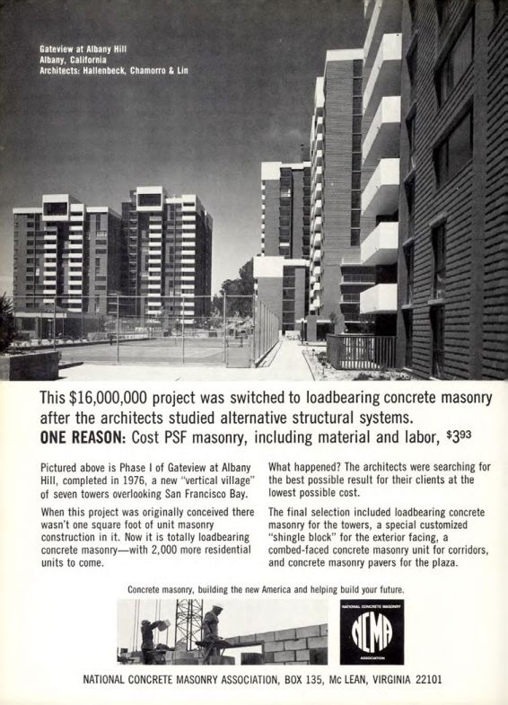 Pictured above is Phase I of Gateview at Albany Hill, completed in 1976, a new "vertical village" of seven towers overlooking San Francisco Bay.