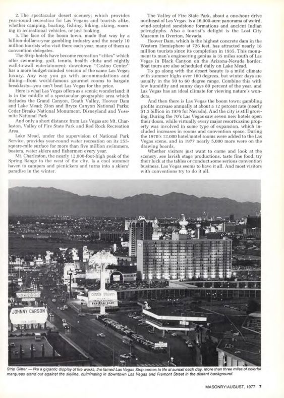 And then there is Las Vegas the boom town: gambling profits increase annually at about a 12 percent rate (nearly $1.3 billion in 1976 for Nevada). And the city is still growing. During the 70's Las Vegas saw seven new hotels open their doors, while virtually every major resort/casino property was involved in some type of expansion, which included increases in rooms and convention space. During the 1970's 12,000 hotel/motel rooms were added to the Las Vegas scene, and in 1977 nearly 5,000 more were on the drawing boards.