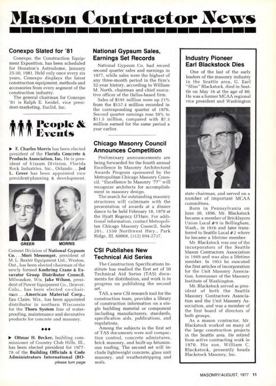 Mr. Blackstock was one of the incorporators of the Seattle Mason Contractors Association in 1949 and was also a lifetime member. In 1953 he executed the first articles of incorporation for the Unit Masonry Association, forerunner of the Masonry Institute of Washington.