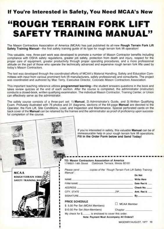 This valuable, new, three-part work was developed to promote a number of Mason Contractor benefits including compliance with OSHA safety regulations, greater job safety, protection from death and injury, respect for the proper care of equipment, greater productivity through proper operating procedures, and a more professional attitude on the part of those who operate the technically advanced and expensive rough terrain fork lifts used by today's Mason Contractors.