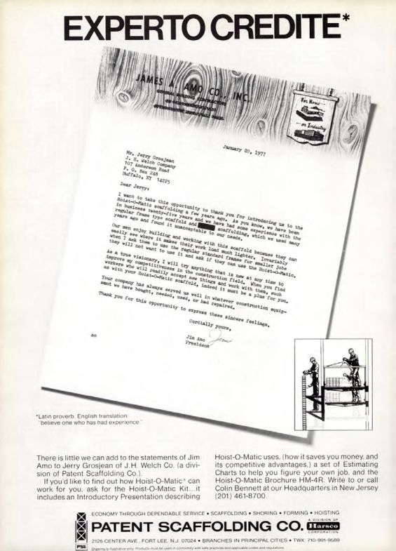 There is little we can add to the statements of Jim Amo to Jerry Grosjean of J.H. Welch Co. (a division of Patent Scaffolding Co.).