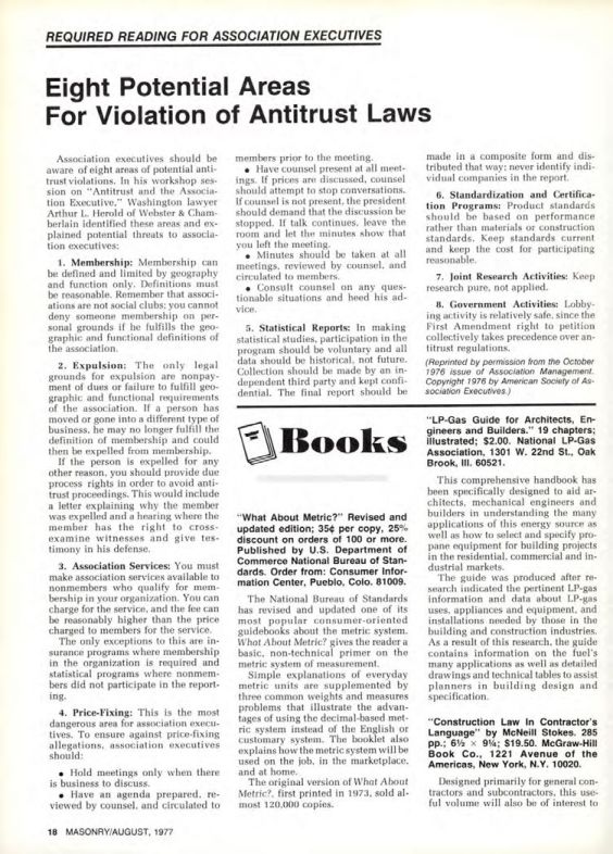 Association executives should be aware of eight areas of potential antitrust violations. In his workshop session on "Antitrust and the Association Executive," Washington lawyer Arthur L. Herold of Webster & Chamberlain identified these areas and explained potential threats to association executives: