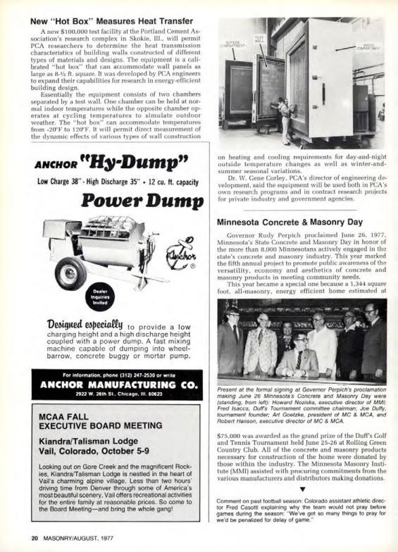 Governor Rudy Perpich proclaimed June 26, 1977, Minnesota's State Concrete and Masonry Day in honor of the more than 8,000 Minnesotans actively engaged in the state's concrete and masonry industry. This year marked the fifth annual project to promote public awareness of the versatility, economy and aesthetics of concrete and masonry products in meeting community needs.