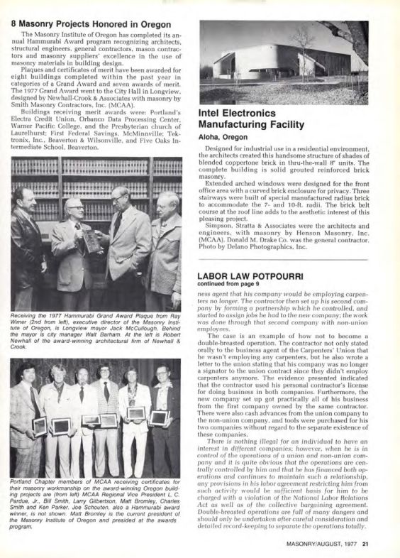 The Masonry Institute of Oregon has completed its annual Hammurabi Award program recognizing architects, structural engineers, general contractors, mason contractors and masonry suppliers' excellence in the use of masonry materials in building design.