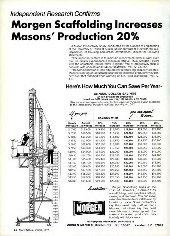 "The important feature is to maintain a convenient level of work such that the mason experiences a minimum fatigue. Thus, Morgen Towers with the adjustable feature allow a higher rate of productivity than is possible with conventional tubular scaffolds." Vol. IV. 3.6.11.1.