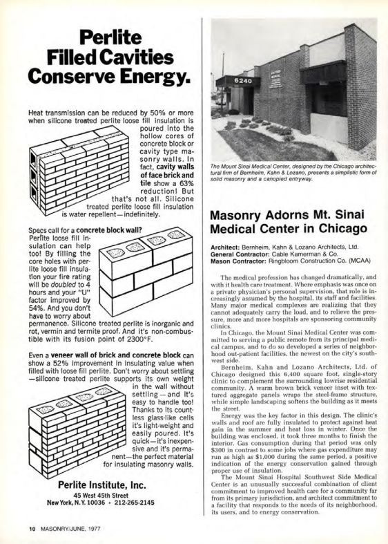 The Mount Sinai Hospital Southwest Side Medical Center is an unusually successful combination of client commitment to improved health care for a community far from its primary jurisdiction, and architect commitment to a facility that responds to the needs of its neighborhood, its users, and to energy conservation.
