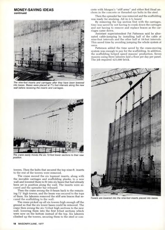 Patterson added the time saved by the crane-moving system was enough to pay for the scaffolding. In addition. the scaffolding helped speed masons' production. Seven masons using three laborers laid a floor per day per panel. The job required 425,000 brick.