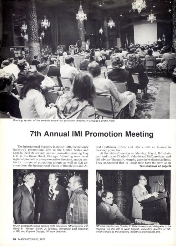 The International Masonry Institute (IMI), the masonry industry's promotional arm in the United States and Canada, held its seventh annual promotion meeting May 8-11 in the Drake Hotel, Chicago. Attending were local/ regional promotion group executive directors, mason contractor trustees of promotion groups as well as IMI advisors from the International Union of Bricklayers and Allied Craftsmen (BAC), and others with an interest in masonry promotion.