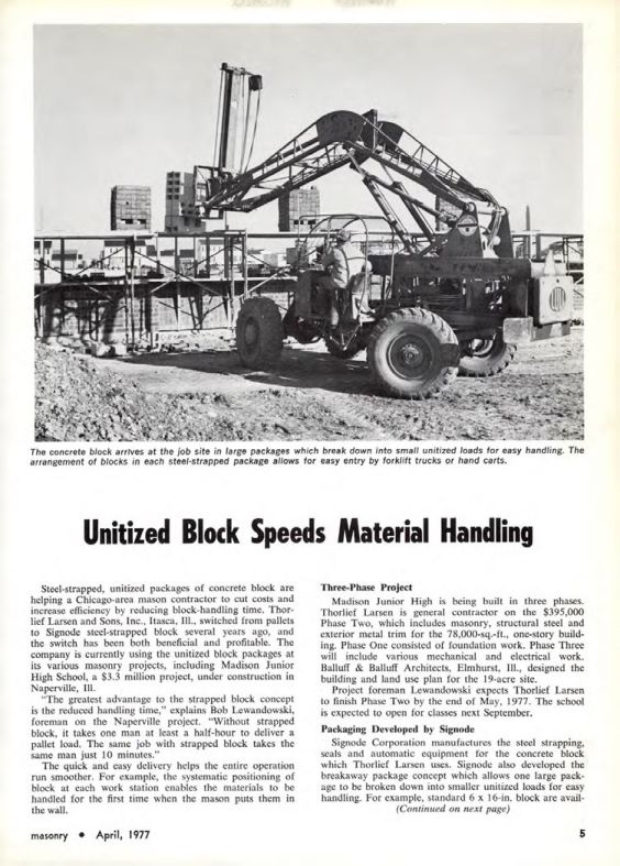 Steel-strapped, unitized packages of concrete block are helping a Chicago-area mason contractor to cut costs and increase efficiency by reducing block-handling time. Thorlief Larsen and Sons, Inc., Itasca, III., switched from pallets to Signode steel-strapped block several years ago, and the switch has been both beneficial and profitable. The company is currently using the unitized block packages at its various masonry projects, including Madison Junior High School, a $3.3 million project, under construction in Naperville, III.