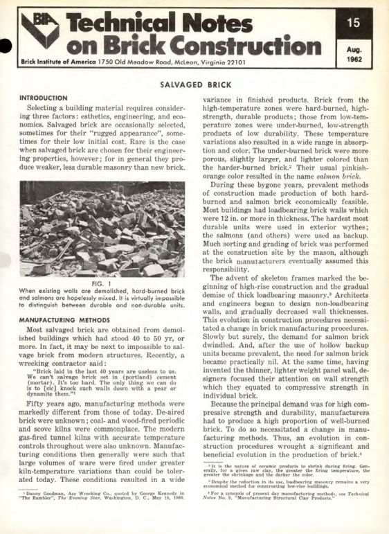 Most salvaged brick are obtained from demolished buildings which had stood 40 to 50 yr, or more. In fact, it may be next to impossible to salvage brick from modern structures. Recently, a wrecking contractor said: