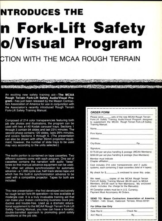 This new presentation-the first developed exclusively for rough terrain fork-lift operation-is now available at moderate cost. It is a truly invaluable training aid that can make your mason contracting business more productive and trouble-free. Used as a dramatic educational supplement to the MCAA Rough Terrain Fork-Lift Safety Training Manual, you now can have a forceful, double-barrelled approach to promoting good safety conditions at the job site.